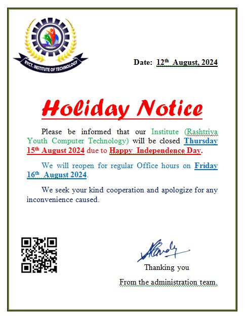 Please be informed that our Institute (Rashtriya Youth Computer Technology) will be closed Thursday 15th August 2024 due to Happy Independence Day. We will reopen for regular Office hours on Friday 16th August 2024. We seek your kind cooperation and apologize for any inconvenience caused. আমরা এই বছর ১৫ আগস্ট ৭৮তম স্বাধীনতা দিবস উদযাপন করতে যাচ্ছি, এ বছর সারাদেশে পালিত হবে ৭৮তম স্বাধীনতা দিবস। এটি একটি গুরুত্বপূর্ণ উপলক্ষ যা ১৯৪৭ সালের ১৫ আগস্ট ব্রিটিশ ঔপনিবেশিক শাসন থেকে দেশের স্বাধীনতাকে স্মরণ করে। এই দিনে দীর্ঘ সংগ্রামের পর ব্রিটিশদের প্রায় ২০০ বছরের দাসত্ব থেকে ভারত স্বাধীন হয়। এমন পরিস্থিতিতে, এই উপলক্ষে ভারতের প্রতিটি নাগরিক দেশের স্বাধীনতা উদযাপন করে। একই সময়ে, ভারতের প্রধানমন্ত্রী লালকেল্লায় তেরঙ্গা উত্তোলন করেন এবং জাতির উদ্দেশ্যে ভাষণ দেন।